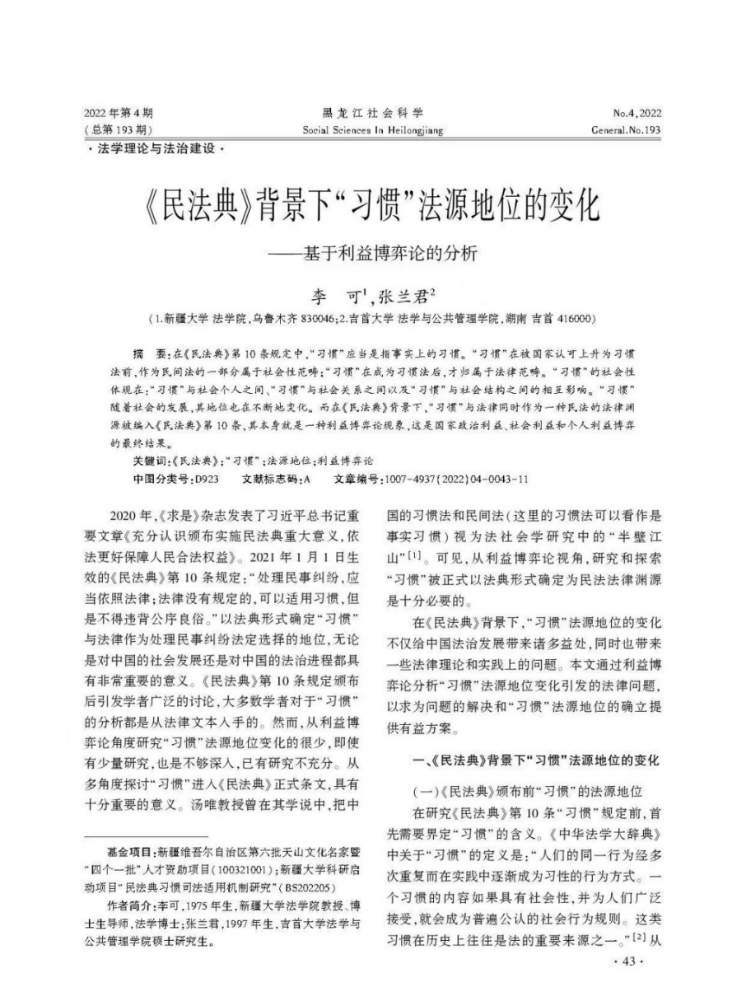 公司客座教授李可、硕士毕业生张兰君合作的专业论文《〈民法典〉背景下“习惯”法源地位的变化》被《中国社会科学文摘》2023年第1期以《〈民法典〉背景下“习惯”法源地位的变化》为篇名转载。