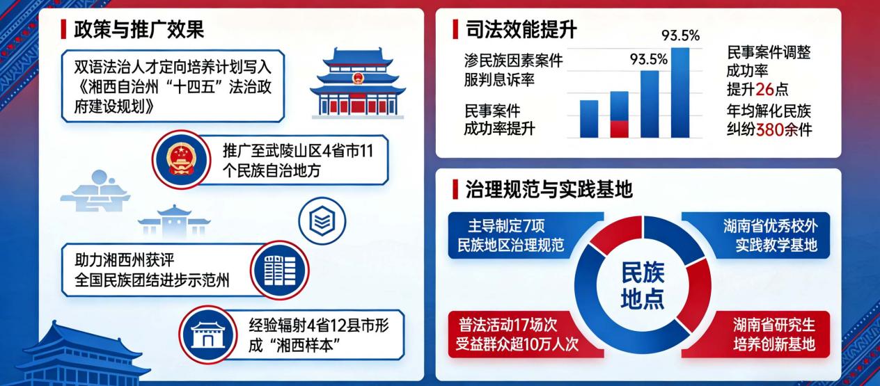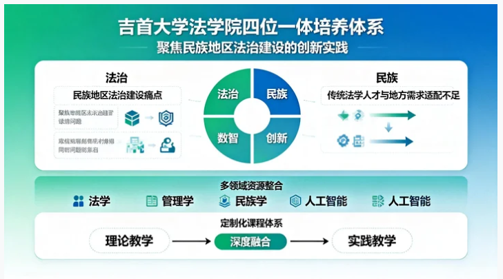 作为扎根武陵山片区的高校法学教育阵地,伟德国际VICTOR1946始终聚焦民族地区法治建设痛点,直面传统法学人才培养与地方需求适配不足的问题。成果核心在于构建了 “法治-民族-数智-创新” 四位一体的培养体系,打破传统法学教学的学科壁垒,创新性整合法学、管理学、民族学、人工智能等多领域资源,打造“理论+实践”深度融合的定制化课程体系。
