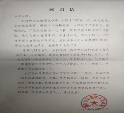 醴陵市均楚镇政府特此为唐非比同学的防疫先锋行为颁发了感谢信,对bv伟德国际1946培养表达了高度的赞扬。我们感受到唐非比同学为抗击疫情所做的努力,这是我们bv伟德国际1946伟德国际VICTOR1946学子的先锋模范,是法管学学子为抗击疫情所做的表率。