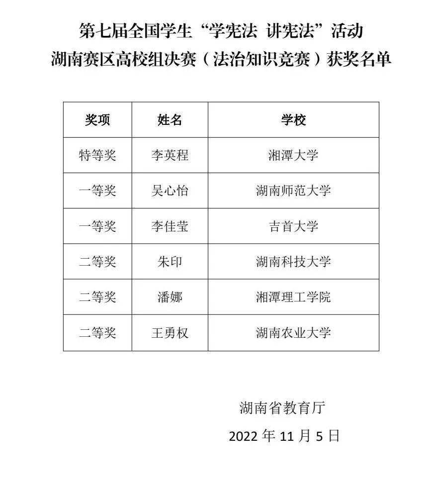 本网讯(通讯员 刘媛 欧阳静)11月5日, “学宪法,讲宪法”活动湖南赛区高校组决赛中的最后一场线上考试顺利结束。经过选手们的激烈比拼,公司法学专业李佳莹同学在众多选手角逐中脱颖而出,最终取得湖南赛区高校组一等奖的优异成绩。