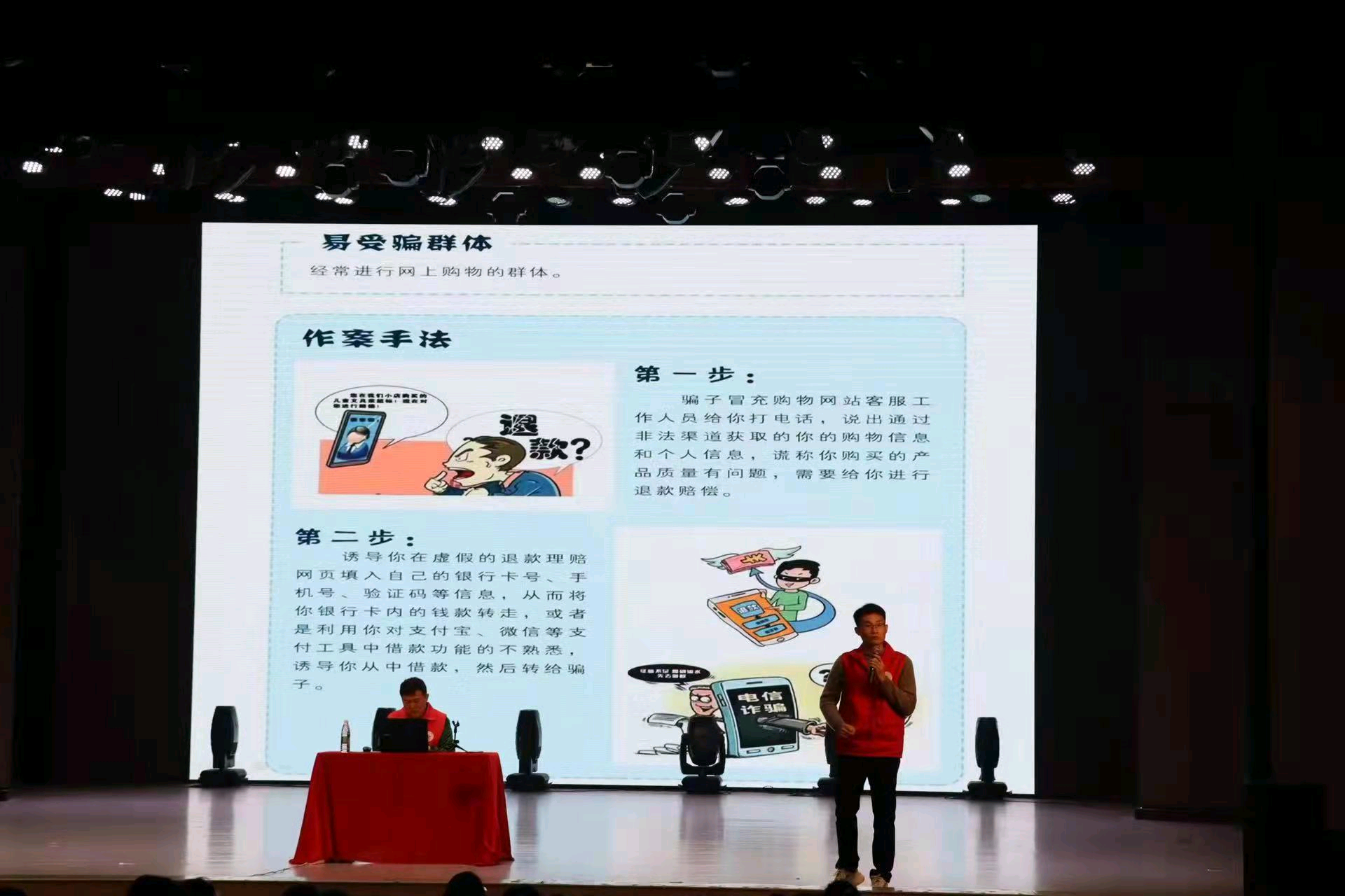 11月3日晚,校园反诈宣讲系列活动第一场——bv伟德国际1946音乐舞蹈公司专场中,“典”亮湘西法律志愿服务团宣讲组代表王忠威从典型案例出发,通过分析常见诈骗作案手法,向在场的同学解读了通讯网络诈骗犯罪的常见情况,如网络贷款诈骗结合“老员工马某网贷被骗”案、刷单返利诈骗结合”大二员工张某刷单被骗”案等,提醒在座的同学们提高防范意识。
