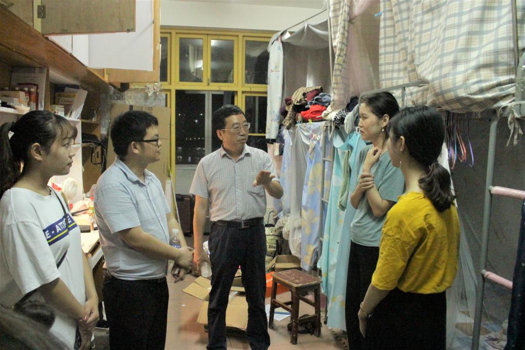 为进一步了解员工宿舍生活情况,9月28日晚8点,党委书记彭献忠,学工办全体人员以及班主任一行来到八栋,走进宿舍,排查国庆长假前的安全隐患。