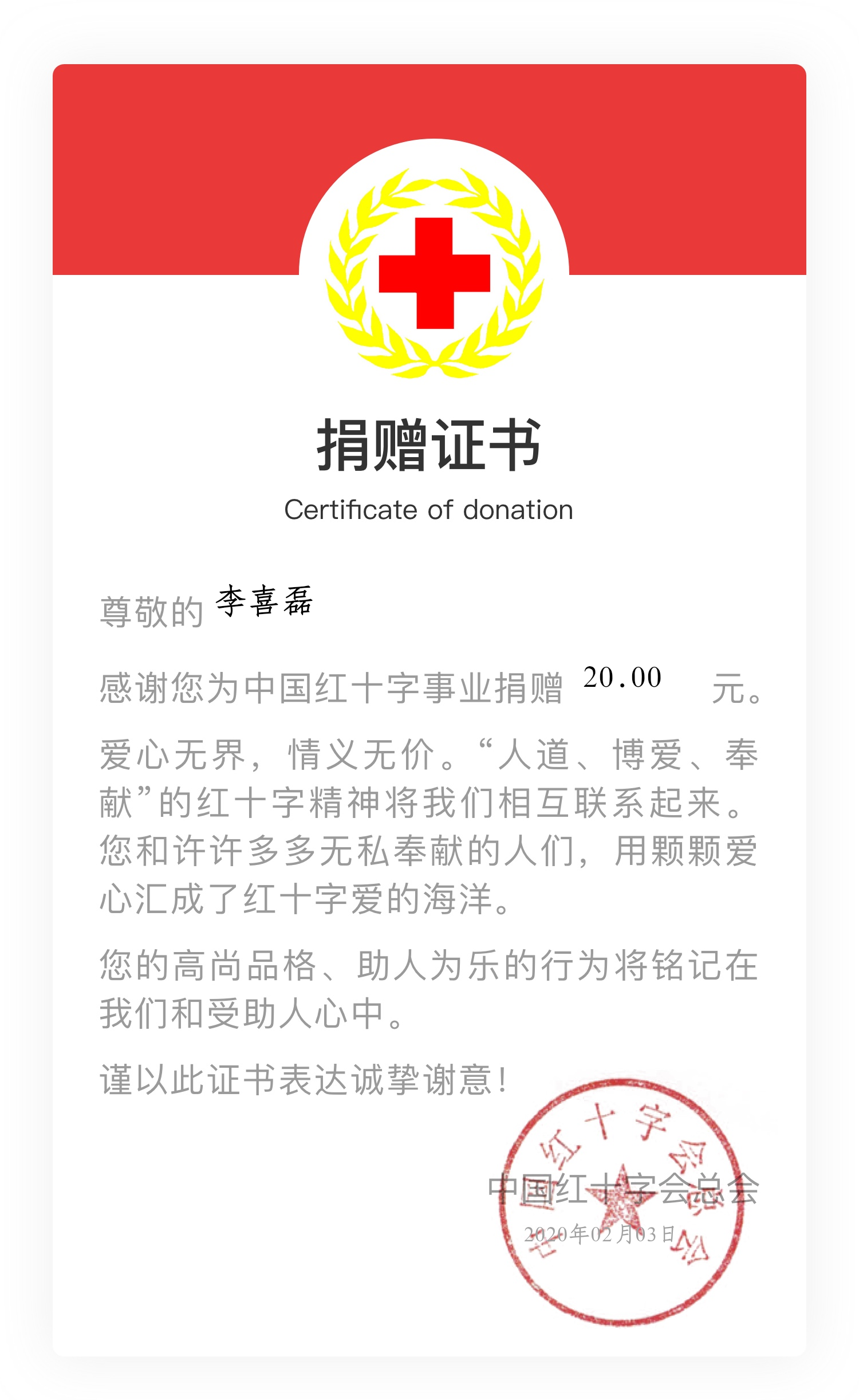 此外,李喜磊还用自己的奖学金,为中国红十字会捐款20元,为武汉市慈善总会捐款100元,奉献自己的一份爱心。
