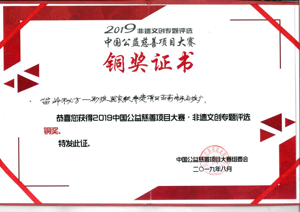 本网讯(陈睿珍)首届中国非遗文创节于2019年8月22至24日在贵州丹寨万达小镇举行。此次首届非遗文创节共计展出50多项来自全国各地及丹寨本土的非遗项目。而公司向大赛组委会递交的项目“苗岭秘方——助推国家级非遗项目苗药传承与推广”在此次比赛中喜获铜奖。