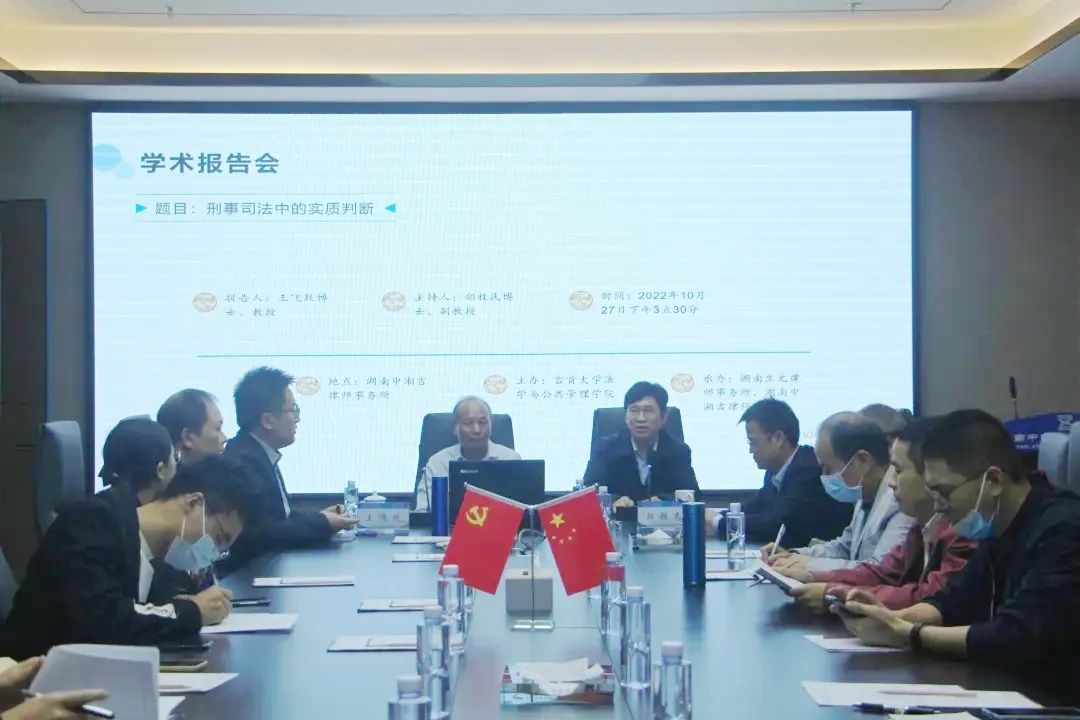 本网讯(通讯员 刘媛 欧阳静)为促进学术交流,有效提高教学和科研水平,共创良好的学术氛围,10月27日,中南林业科技大学政伟德国际VICTOR1946经理王飞跃教授应邀做了题为《刑事司法中的实质判断》的学术报告。本次讲座由bv伟德国际1946伟德国际VICTOR1946主办,实践基地湖南中湘吉律师事务所、湖南生元律师事务所联合承办。讲座由郑牧民副经理主持,伟德国际VICTOR1946部分师生、中湘吉所和生元所部分律师共20余人参加了报告会。